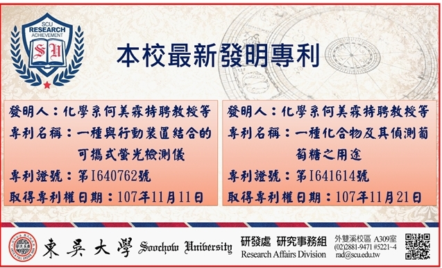 本校最新獲得發明專利兩件,均為化學系何美霖特聘教授及其研究團隊因執行科技部計畫所衍生之研究成果,分述如下: