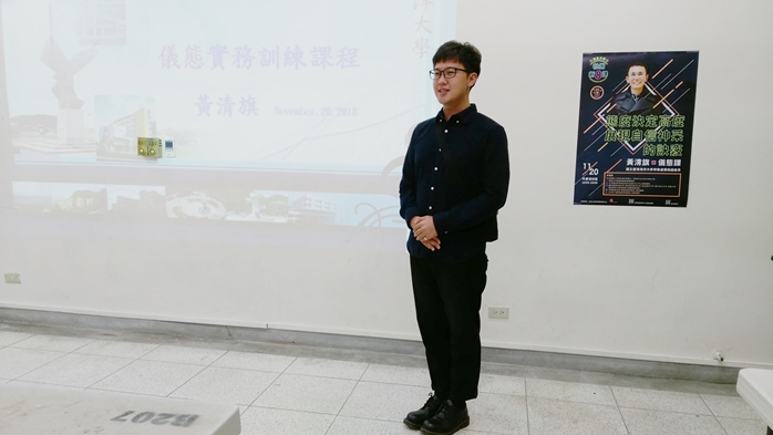 本校群育暨美育中心107年11月20日在外雙溪校區綜合大樓B209教室舉辦社團新8課系列課程「儀態課」。課程邀請到國立海洋大學學務處課指組組長黃清旗為各位同學講解得宜的儀態展現方式,並且透過親自示範和實作,讓同學不僅學得到,還可以立刻「帶得走」。