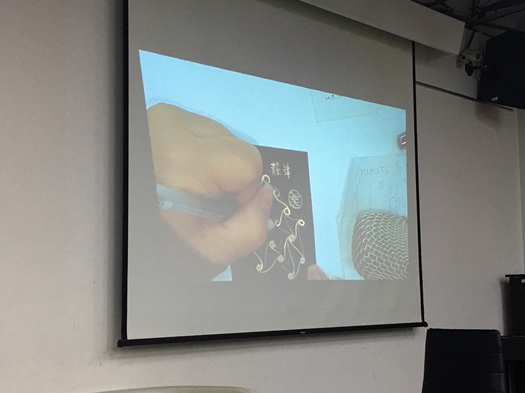 林老師一開始介紹禪繞五元素——點、直線、彎線、曲線、圓圈,她說這五個元素就像是積木,只要運用這五個點線圓,就可以完成一幅非常特別的禪繞畫。林老師示範了四種不同的禪繞畫,分別是奇可(KEEKO)、尼澤伯(NZEPPEL)、昂納馬托(ONAMATO)以及韻律(CADENT),雖然完成圖看起來非常複雜,但其實只需運用五元素的其中兩種,一直重複地畫,加上一張很小張的紙就可以完成。人們可以從不同的方向欣賞,這個抽象而不具象的特別藝術。