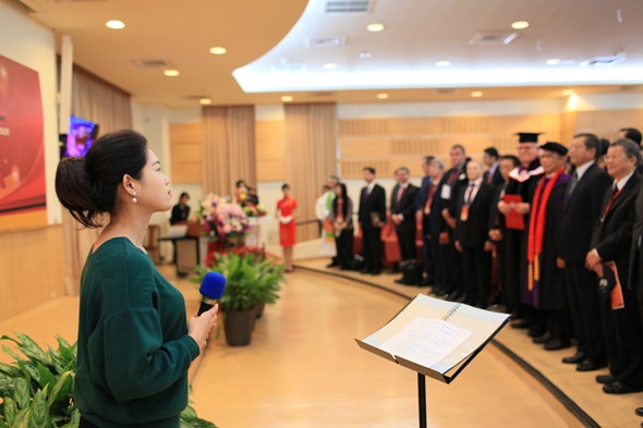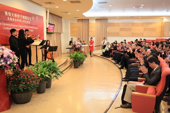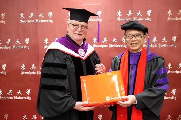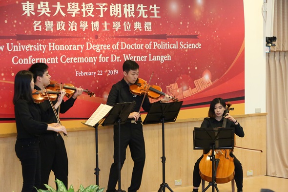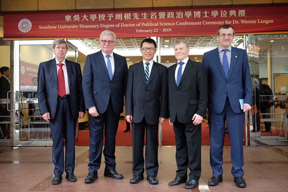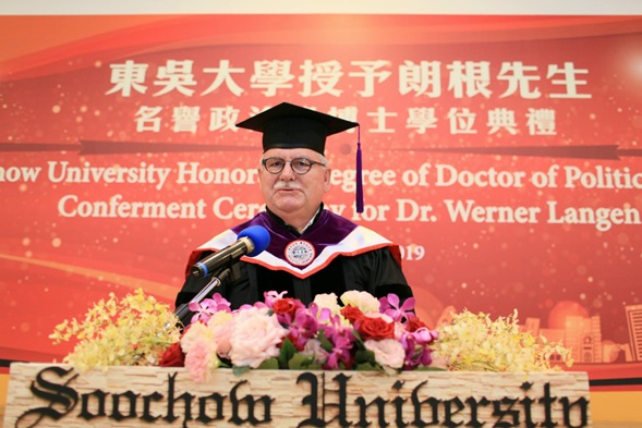 典禮上,潘維大校長頒發博士學位證書予Werner Langen先生,Werner Langen感謝東吳大學給予他的榮譽,同時,也將此榮耀獻給歐洲議會友臺小組的每位成員。Werner Langen更以「臺歐盟關係」為題發表20分鐘的演說,他首先點出臺灣在國際中的重要地位及影響力,並強調歐盟將持續支持臺灣,即使未來在面臨軍事行動威脅的情況下,仍要與中國大陸在兩個平等國家的基礎下進行和平談判,同時呼籲台灣的未來應該由台灣人民透過民主、政府尊重民意的方式決定。