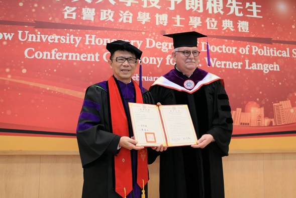 為感謝Werner Langen對臺灣多年來的重要貢獻,以及彰顯其身為政治工作者所秉持的人道關懷之精神,本校於108年2月22日舉辦授予Werner Langen先生名譽政治學博士學位典禮。Werner Langen先生為歐洲議會議員暨友臺小組主席,長期致力於促進世界和平及文化交流,且多年來協助我國推動對歐要案、提升臺灣外交形象不遺餘力。