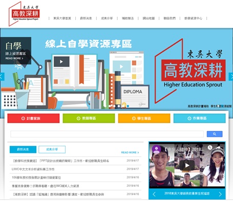 「東吳大學高等教育深耕計畫網站」(以下簡稱高教深耕網)依使用者身份,進行全校計畫相關之教學法規、措施、活動訊息、成果展示之資訊統整,並經系統性分類,及快速影音、分眾專頁等多項特色功能,以期提高使用者知覺易用性(Perceived Usefulness)。