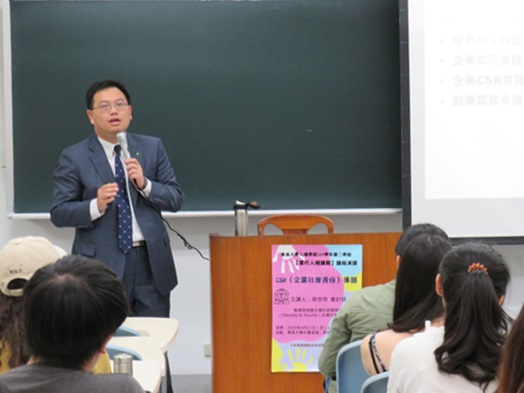 本校人權學程於2019年4月11日,邀請勤業眾信聯合會計師事務所企業社會責任負責人吳世宗會計師,與學生分享商業與人權的關聯,以相關實務經驗來說明企業負擔社會責任對企業本身與社會大眾的影響。