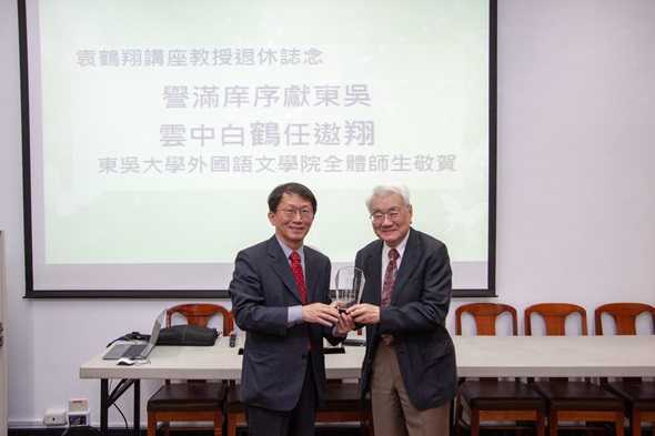 英文系袁鶴翔講座教授為比較文學領域大師,亦為本校英文系校友,2000年應時任外語學院謝志偉院長及英文系張繼莊主任之邀,於當時初設立的比較文學碩士班擔任客座教授,其後數年陸續獲禮聘為外語學院謝東閔人文社會講座教授、東吳文理講座教授。袁老師將於今年夏季自本校退休,外語學院特致贈「譽滿庠序獻東吳/雲中白鶴任遨翔」水晶紀念講座,祝福袁老師退休生活平安順利。
