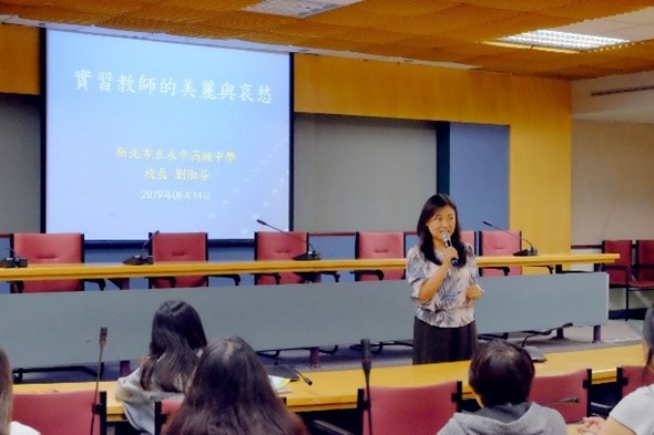 下午特地邀請新北市立永平高中劉淑芬校長,以「實習教師的美麗與哀愁」為題,分享在教育實習時該有的態度,與現今教學現場對於實習老師的期待,以及未來教師更具備的專業能力。淑芬校長以風趣的提問方式,一一點出教育實習的核心與關鍵,並以其女公子操玫萱老師為例,分享玫萱老師從前實習時的時間分配,以及準備教檢、教甄的經驗,玫萱老師自律的態度,讓她實習結束後通過教師檢定考試,並且考取新莊高中輔導科正式教師。2小時的演講中,淑芬校長以正面、積極與樂觀的態度,影響了在場的教育實習生,讓生學更有勇氣面對接下來的人生挑戰。
