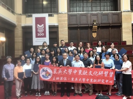 本校中東歐研究中心於2019年8月18日至9月1日,舉行為期15日的暑期中東歐文化研習營,由張家銘主任與鄭得興執行長帶領34位教職員生,前往中歐五國進行學術交流與社會踏查,其中特別在斯洛伐克考門斯基大學舉辦4天的文化研習營。營隊出發前分別在6月26日、7月24日、8月13日,進行行前工作坊,研習相關課程的講授、社會踏查主題的討論及行前資料的查找,幫助團員們了解營隊目的並融入中東歐學習氛圍中。各組踏查主題包括「中東歐民間交易支付考察」、「布拉格空間整治與台北都市治理之比較」、「中東歐的節慶與民間習俗」、「東西方陶瓷器比較」、「中東歐民謠」,社會踏查結果預定在108學年第一學期進行分享會。
