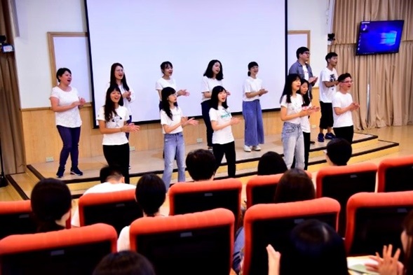 校牧室青年團契的學長姐們的亦在始業式以歌舞歡迎境外生,透過德育中心、健諮中心、軍訓室、語言中心及國際處同仁的業務簡介及說明,讓境外學生能早早做完收心操,以迎接豐富精采的東吳第一哩系列活動,讓境外生歡喜迎接大學生活。