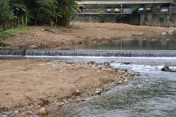 總務處在日常巡視的過程中,觀察到雙溪河道已有多年未曾疏浚,從原本寬闊清澈,到如今狹窄且雜草叢生,消波塊和石頭堆積使得水流變得不順暢,令人痛心!且外雙溪校區在近年多次颱風或豪雨中遭到衝擊,不時發生淹水的情況,應與河道未定期疏浚有相當大的關係。故向董保城副校長陳報,本校應盡快向水利局提出整治外雙溪河道之迫切需求。