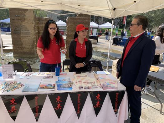 今年2月19日本校受邀參加該校的海外留學展(Study Abroad Fair),南加州校友會作為母校與查普曼大學的橋樑,孫會長受託協助宣傳,義不容辭地號召並組織南加州校友會的校友一同出力參展,學長姐穿著南加校友會的制服,不畏南加州的豔陽高照,精心布置攤位,並特別製作學校英文網頁QR code及Google問卷表單,供學生下載填寫,讓母校能與有興趣的學生更進一步的聯繫。學長姐盡心盡力推廣並介紹母校的交換資訊及華語學習,傳遞東吳人滿滿的熱情與活力,成功吸引多位查普曼大學的學生,表示有意願至本校交換或學習華語。
