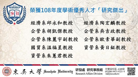 「研究優良」:中文系鹿憶鹿教授、中文系連文萍教授、日文系王世和教授、日文系羅濟立教授、日文系劉怡伶教授、日文系陳相州副教授、化學系呂世伊教授、化學系謝伊婷副教授、法律系洪家殷教授、法律系李貴英教授、經濟系謝智源教授、會計系洪聖閔副教授、企管系王昱凱副教授、國貿系顧萱萱教授、國貿系陳金盛副教授、資管系楊欣哲教授、資管系黃心怡副教授,每位教師可獲獎勵金6萬元。