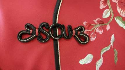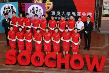 值得一提,東吳親善團的旗袍,布料絲綢兼防皺,長度是依黃金比例,合身合宜,特別襯托親善大使的端莊優雅與年輕人的活潑朝氣,最特別的是領口的扣環,一般慣見的都是雙豆扣,旗袍領口扣環卻是特製的「SCU」字體呈現,讓人一眼就看到東吳大學的校徽象徵,每位穿著這身旗袍的親善大使代表著東吳的精神「養天地正氣,法古今完人」。