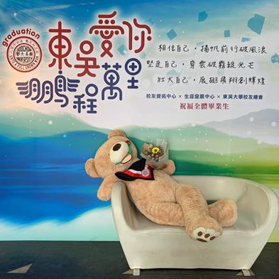 非常時刻必須維持社交安全距離,但不讓東吳人的心因此變疏離,學校也特別在校園多處設立「戶外拍照留影區」讓畢業生捕捉美好的一刻,除了有「東吳愛你、鵬程萬里」打卡按讚即可領取專屬109級畢業生的小熊和印章,另有「SCUtogether」的打卡活動,不限任何方式,只要照片中出現東吳大學的縮寫SCU,並打卡上傳臉書或IG,就有機會獲得蘋果無線耳機(AirPods Pro),各式活動讓畢業生感受滿滿祝福的心意。