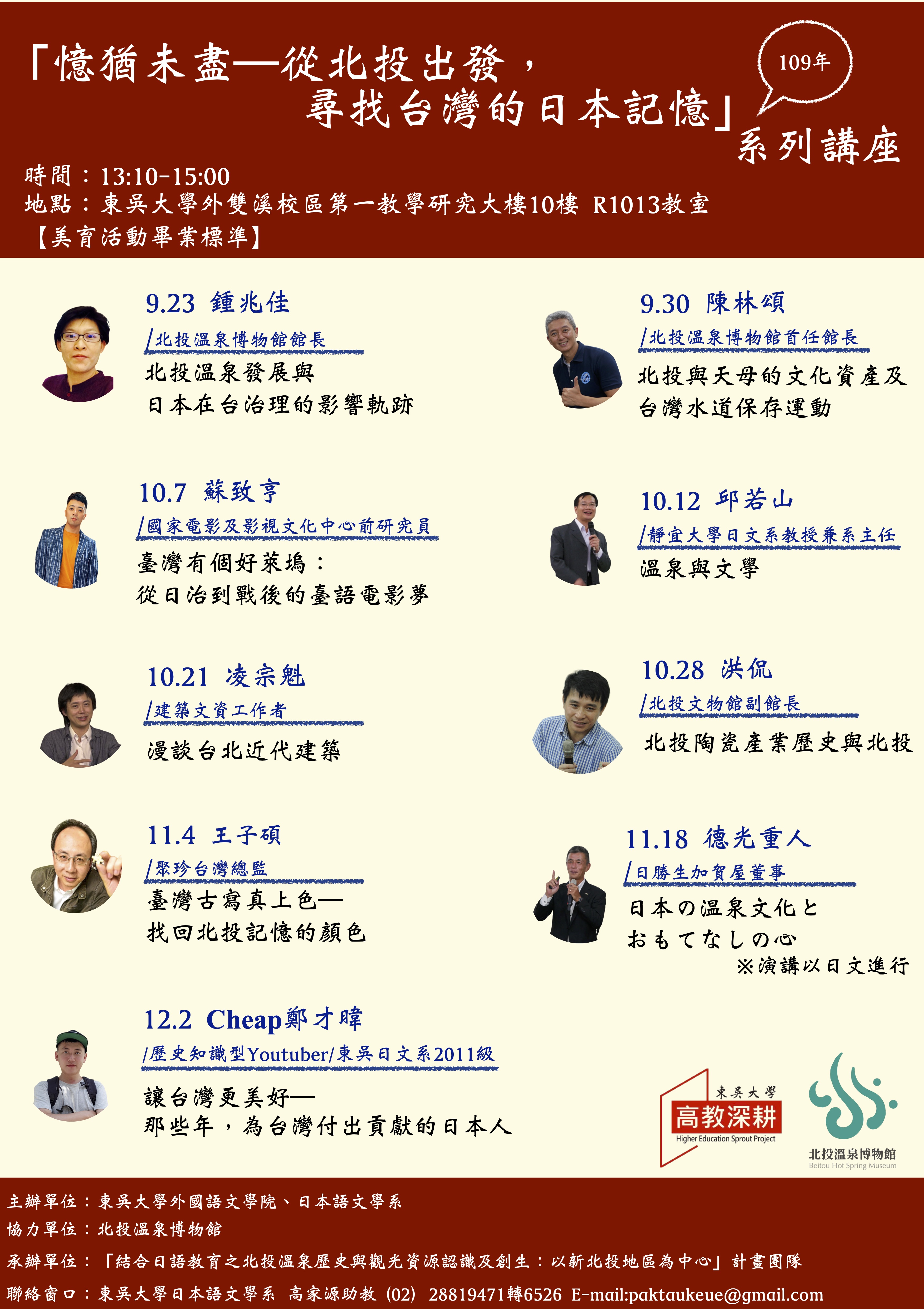 本次講座主題以北投為出發點,以台灣記憶為中心,邀請的講者個個都是跨界、跨領域、跨文化的專家與研究者,包含: