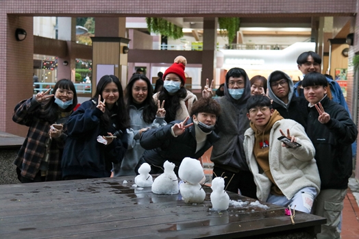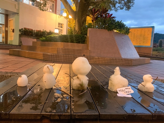受寒流影響,全臺氣溫驟降,連陽明山也在1月8日凌晨下起皚皚白雪,而本校外雙溪校區,竟從早上開始出現了一隻超萌小訪客,吸引眾人圍觀拍照,截至下午5點為止,甚至有越來越多的趨勢,一隻隻高矮胖瘦、形狀各異的小雪人,成群結隊地在八角亭旁排排站好,大家紛紛直呼「好想帶回家」、「上山追雪吧」。