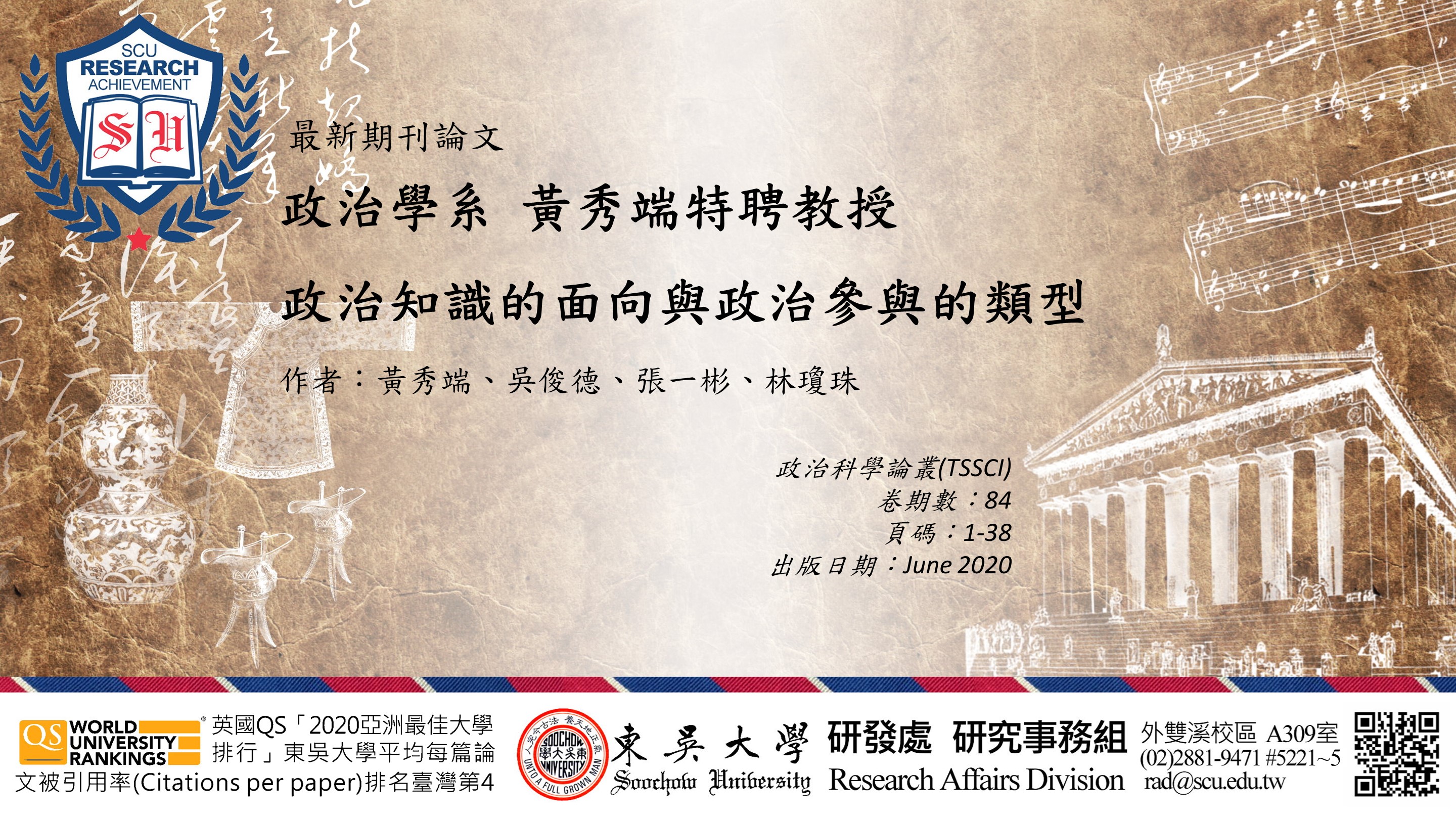 研究事務組小提醒:教師如有最新發表於AHCI、SSCI、SCI、EI、TSSCI、THCI、「東吳大學外語學門獎勵名單」之期刊論文,歡迎將相關資訊e-mail至rad@scu.edu.tw,研究發展處將會公告於校園頭條,以廣交流。