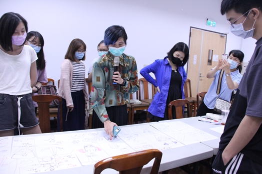 課程採分組方式進行創作,藍尼老師一開始依不同運動類型分為球類運動、重量運動、佛系運動、極限運動、有氧運動五組,並進行四場繪畫活動,各種考驗大腦與手的協調,過程中大家驚呼連連,創作出各種不同風格的作品,十分有趣,最後則依組別,共同創作一幅短篇故事,同時學習敘述故事與分鏡的技巧,共同體驗創作的樂趣。