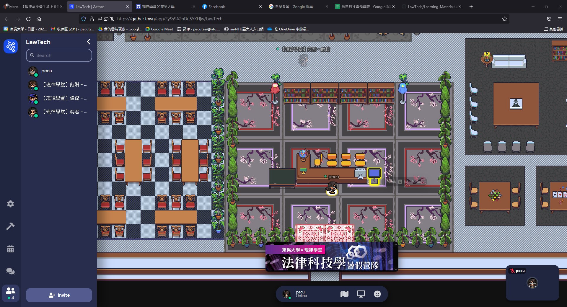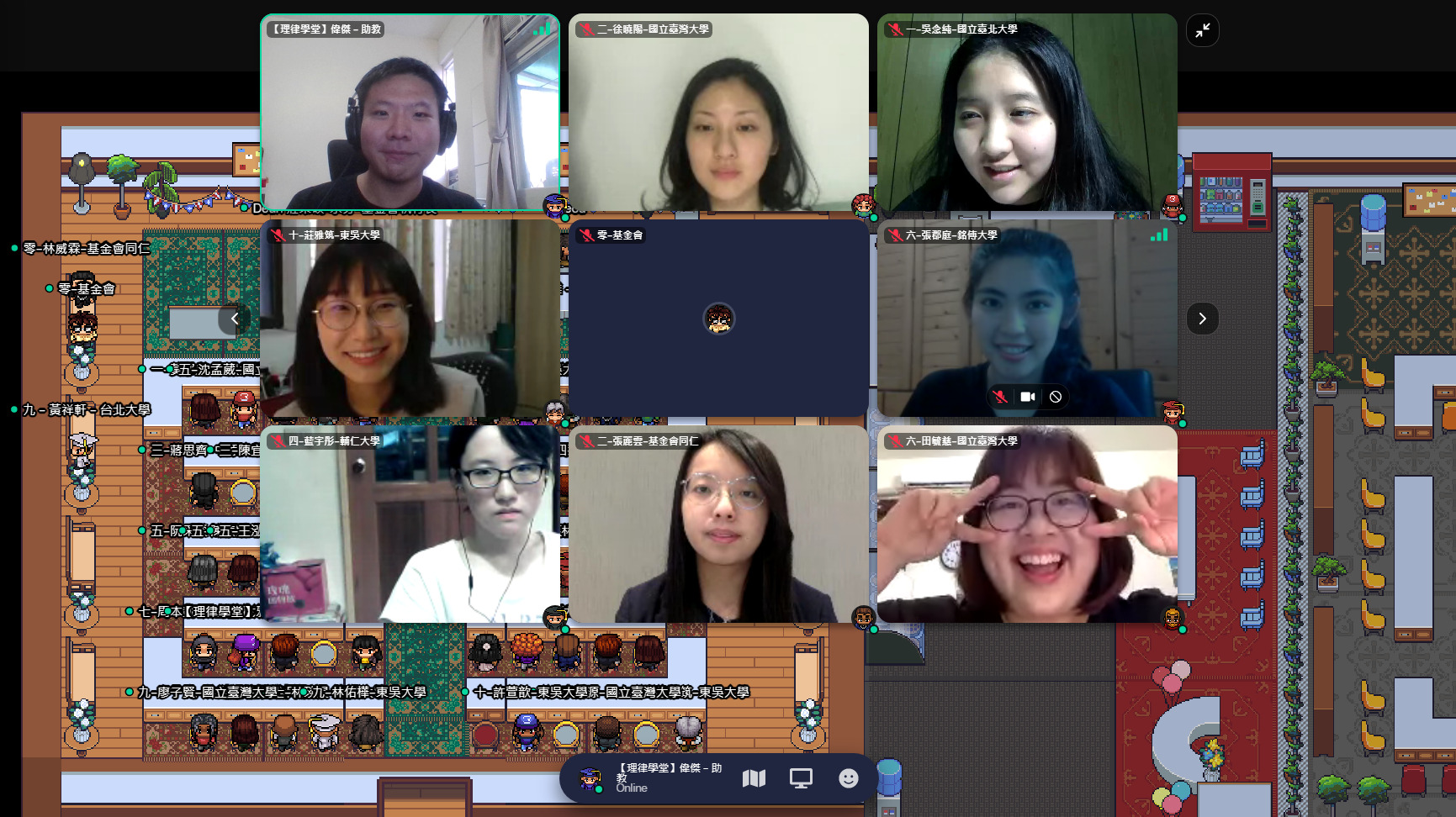 本次營隊課程目標為引導對法律科技(LawTech)有興趣之在學學生,認識、使用Python對開放資料進行蒐集與整理,並透過自動化整理後的資料,進行文字探勘與應用、發想及實作,活動由蔡芸琤老師主導規劃與授課。蔡老師認為帶著無程式基礎的法律系學生學程式設計,並培養同學使用資料分析工具,分析裁判資料,並從中發掘及解決問題,是本活動最大的挑戰。除此之外,因應疫情,如何將各項適合在現場教學的體驗學習活動打包上線,更是考驗著授課教師與助教團隊們,在教材教法及課程設計的能耐。從實體轉線上營隊,課程規劃團隊必須預備每堂課所需的範例程式、線上回饋互動橋段,並與學生做「營隊行前上線學習引導」。本課程師生使用Gather線上教室,在不同的課堂中,設計主教室與分組提問教室,教師與助教團隊得以即時回應與協助同學。課後教師與助教團隊依據學生回饋滾動修正教學策略。