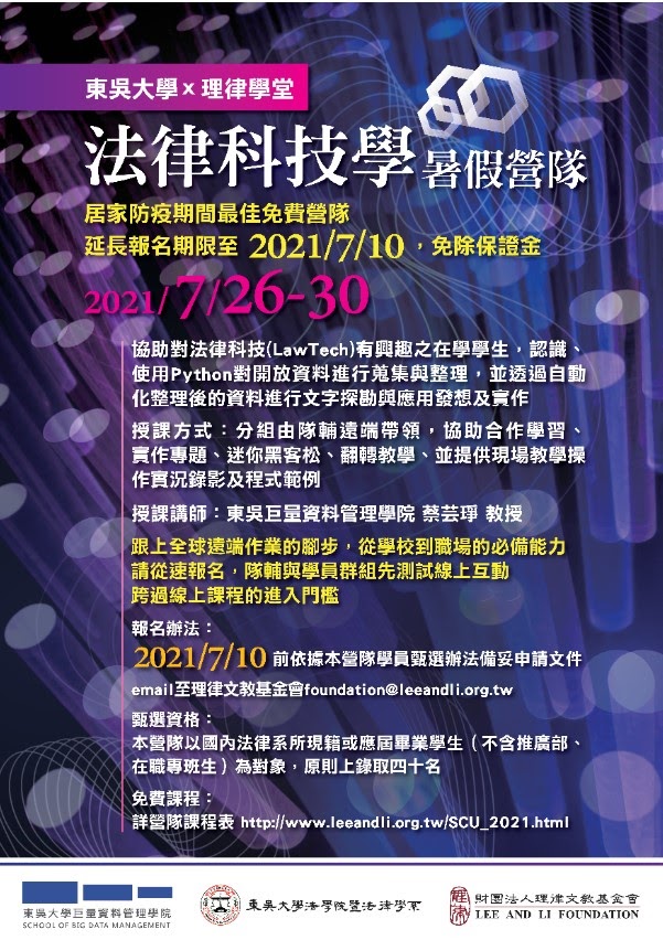 巨量資料管理學院與理律文教基金會於今(110)年首度合作「2021法律科技學暑假營隊」,40位來自全國各大專校院法律相關學系的學員,在本學院蔡芸琤助理教授及由資料科學系及法律系同學合組之助教團隊的帶領下,深度體驗資訊融入法律的專題合作學習。歷經五天的密集線上學習,於7月30日期滿結業。本活動原規劃在本校外雙溪校區舉辦,受新冠肺炎疫情影響,調整為線上學習模式。