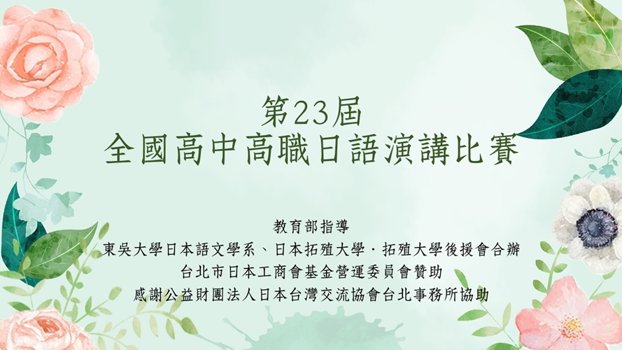 今年因受疫情影響,由教育部指導,本校日本語文學系、日本拓殖大學及拓殖大學後援會主辦的「第23屆全國高中高職日語演講比賽」,於110年10月16日以線上方式舉辦。初賽由來自全國各地高中職學生爭取15個決賽名額,比賽競爭激烈,最終由台北市立內湖高中李翔恩同學,以演講主題「まさかの時の友こそ、真の友」(患難見真情)榮獲第一名,並獲頒8,000元獎金。