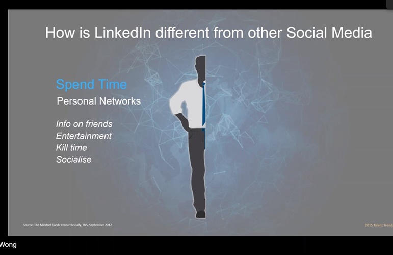 講師Ivan提到,科技的進步、網際網路的發達,有97%的人透過網路上的媒介建立履歷,在面試前大都是透過網路上的履歷,建立第一印象。因此,不論是應徵者或是公司企業,都需要締造好的形象。他認為LinkedIn平台和一般求職網站的定位不同,更像是個社群媒體,此平台想要帶給使用者的體驗正是能在個人身上產生連結,並利用程式設計以及瀏覽器的協助推播,讓他人接收你的資訊、擴大你的潛力、增加你的機會。