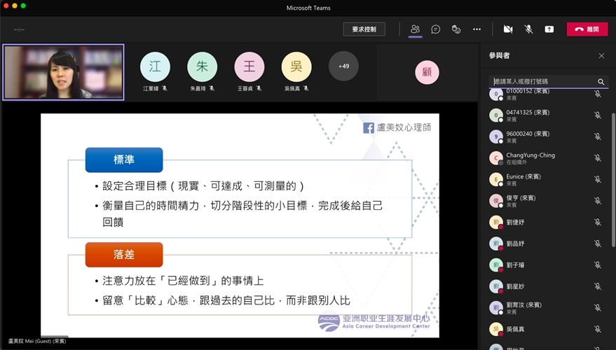 「該做的事情很多,卻沒行動;告訴自己下次絕對要早點開始,卻往往事與願違」,你常陷入這樣的拖延循環嗎?本校健康暨諮商中心邀請諮商心理師盧美妏,於110年11月3日透過線上會議舉辦「告別拖延症—如何幫助自己更有效能的展開行動」講座,帶領同學從心理學角度分析拖延背後的成因,與展開第一步行動的關鍵。