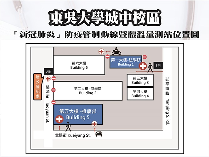 A.行走路線:可由延平南路路口進入崇基樓前帳篷量溫,或從五大樓入口進入量溫。