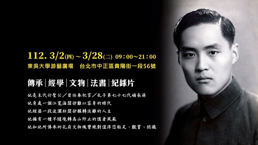 本校儒道智慧永續應用全球中心、通識教育中心及中華大成至聖先師孔子協會共同主辦的「時空記憶——典型在夙昔,孔府瑰寶大展」將於112年3月2日,在東吳大學城中校區游藝廣場隆重開展。