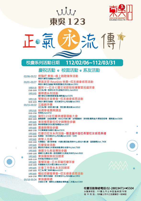 東吳大學建校123年校慶典禮暨運動大會,將於112年3月18日在外雙溪校區盛大舉行。本次校慶群育暨美育中心舉辦「綠聚人市集」號召社團擺台,提供美食、音樂表演及永續主題活動,邀請大家響應環保,而「星光音樂會」則邀請閻奕格、吳汶芳、HowZ等多位人氣歌手獻唱,卡司陣容堅強。眾多活動期待吸引更多學生、校友回母校,也呼應本次的校慶主題「正氣永流傳」精神,讓東吳人團圓,齊聚母校慶生。