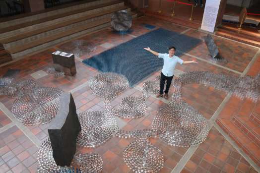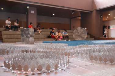 李老師在談論到作品於望星廣場與游藝廣場的差別時,特別提到空間性的概念,在望星廣場開放的空間當中,每一片落葉,或鳥兒偶之飛下,或者學生吃飯,無意間都成為了作品的一部份,更造就另一種別緻。訪談之時正值午餐時間,老師突然起身說道: 「等我5分鐘,現在學生最多在望星廣場吃飯,我要去拍幾張照片記錄一下。」李老師當下十分真切流露出的藝術家真性情此刻反倒顯得有些可愛。