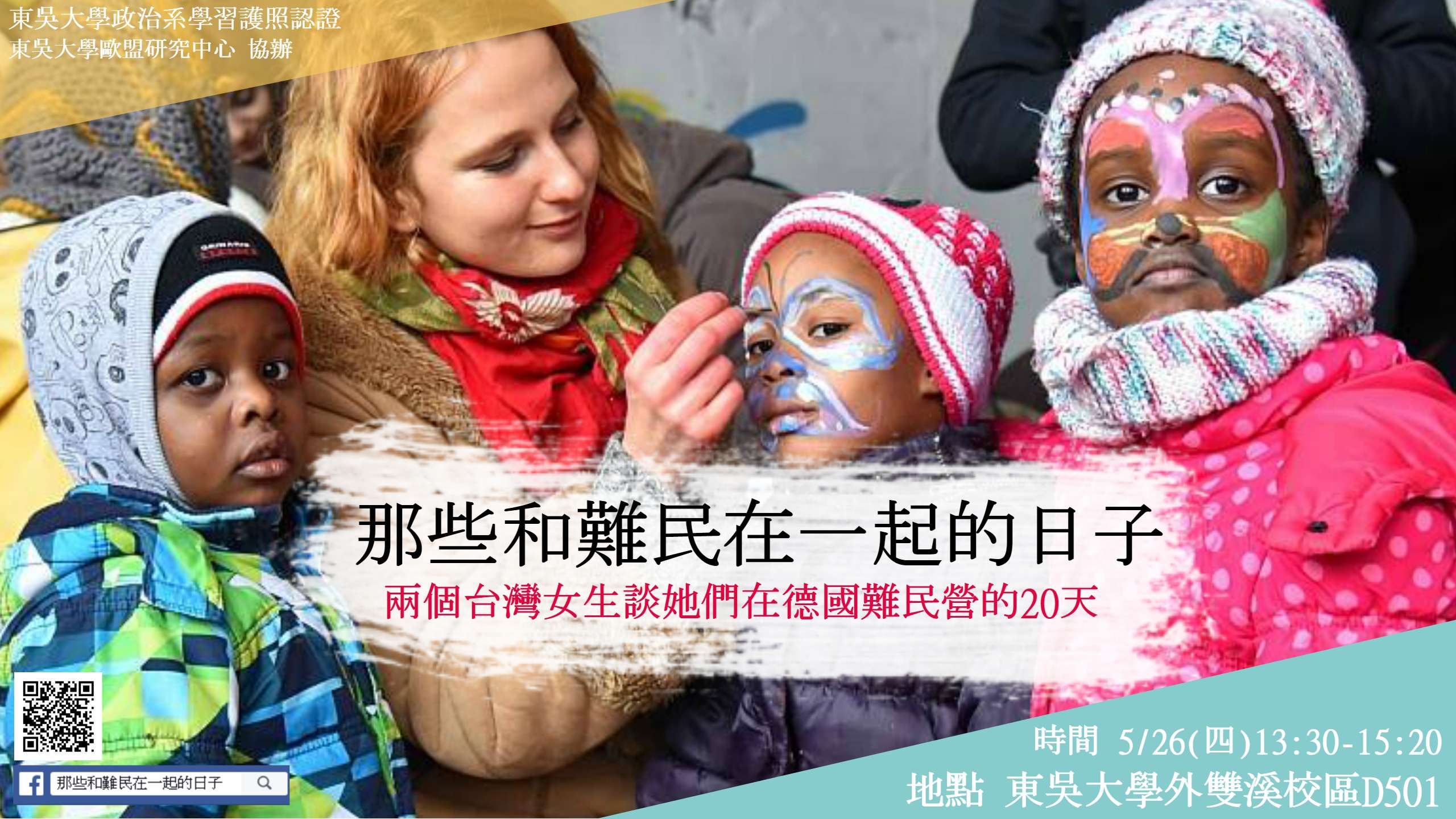 5月26號星期四,政治系二年級同學邱亭雁與許芷敏,於外雙溪校區第二教研大樓D501教室「那些和難民在一起的日子」分享會侃侃而談前往德國柏林難民營擔任志工的動機與經驗。2011年敘利亞內戰爆發後,直至2016年,難民議題依然是國際新聞的一大焦點,歐洲各國對於難民的處置政策仍有諸多討論空間。兩位同學在台灣接收國際媒體報導難民的新聞,持續關注著國際人權問題,在德國爆發科隆集體性侵案後,更加深了他們對於難民政策議題的質疑與好奇,也希望自己能夠盡一份心力幫助難民。