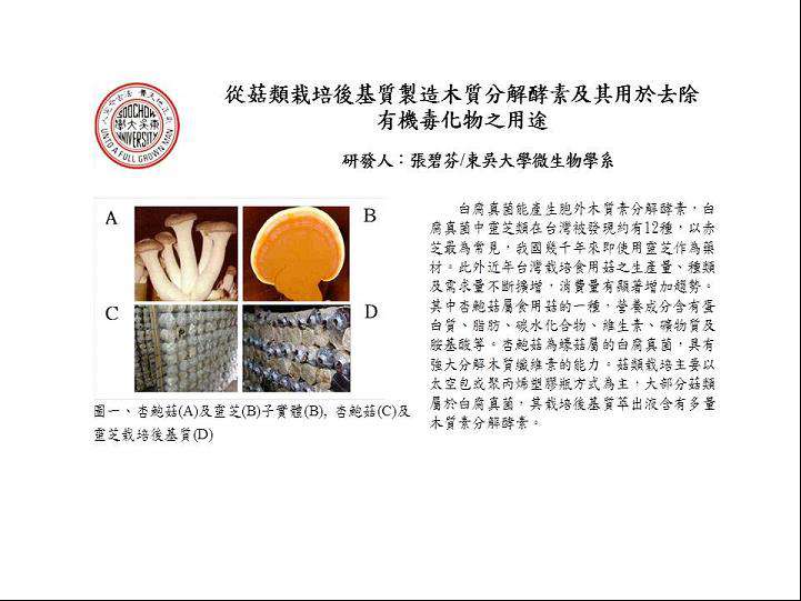 4.「從菇類栽培後基質製造木質分解酵素及其用於去除有機毒化物之用途(發明人:微生物系張碧芬教授) (第 I 481712號)