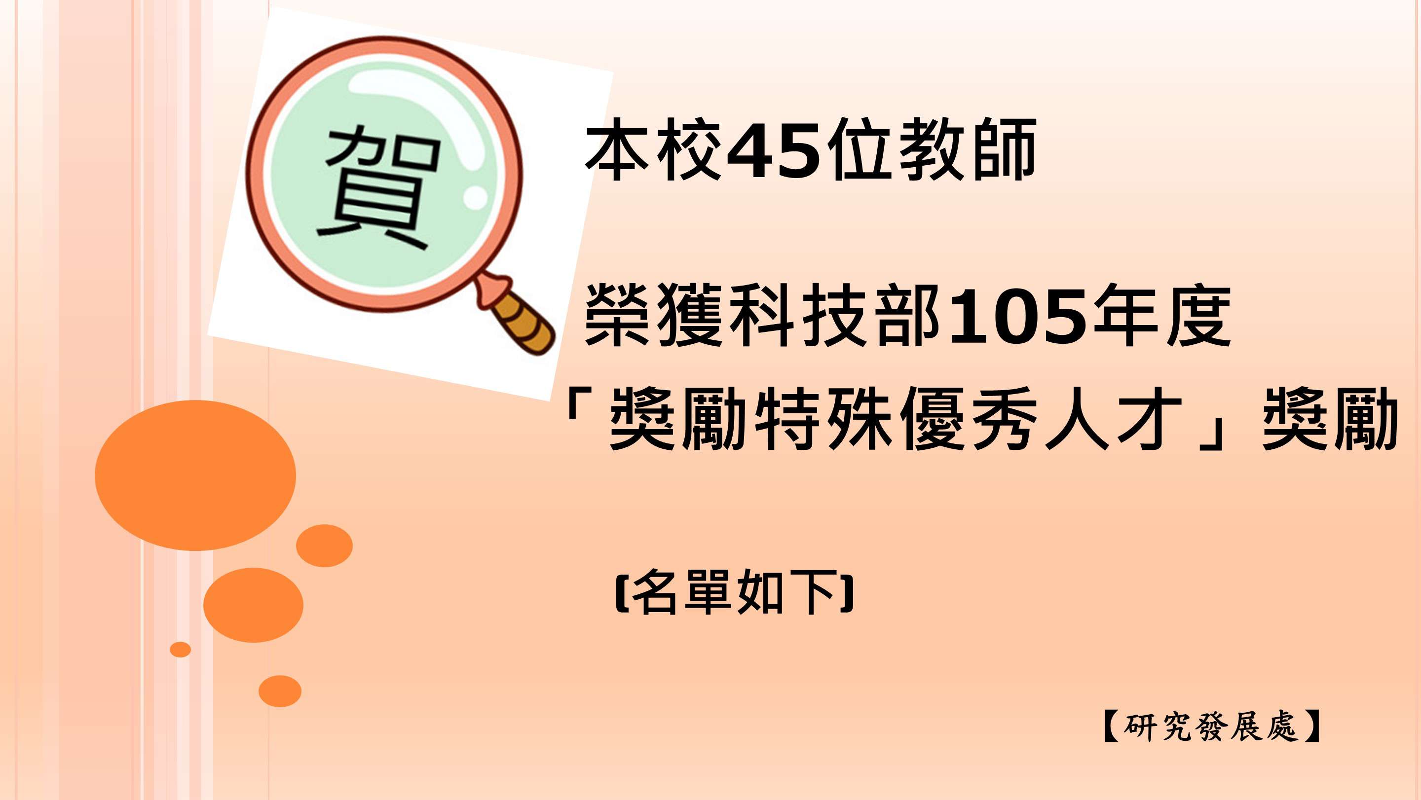 科技部日前公布105年度「補助大專校院獎勵特殊優秀人才措施」獎勵名單,本校共計45位教師獲獎,名單如下: