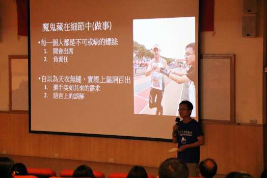 最後,曾志龍提及自己因東吳超馬而成為東吳榮譽校友,他的馬來西亞的朋友曾詼諧地問他:「怎麼你跑個步,就大學畢業了?」而他燦爛地笑著回:「是啊,我跑24小時畢業啦!可是,真的跑24小時就能畢業嗎?跑步是我的終生作業,是需要持續努力的。人生無界限!」曾志龍挑戰自我的態度,激勵台下學生志工學習選手超越自我的勇氣、挑戰極限的精神、堅持完成的意志。