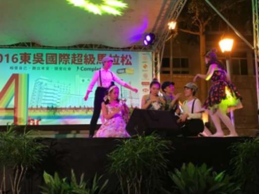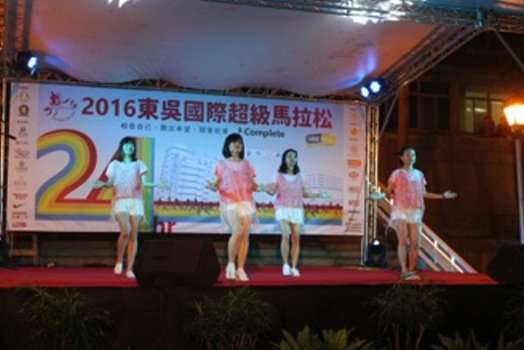 2016東吳超馬於今年12月3日上午9時正式開跑,從白天到黑夜,跑道上的跑者以堅強的毅力持續向前,場邊志工的加油聲從不間斷,但入夜之後,寵惠堂前的舞台燈亮了,東吳大學超級馬拉松的另一項重頭戲,精彩的晚間表演活動熱鬧登場,不論是深情歌唱、賣力跳舞,還是動情的戲劇表演,心之所向,都是希望帶給場上的跑者們更多的力量。