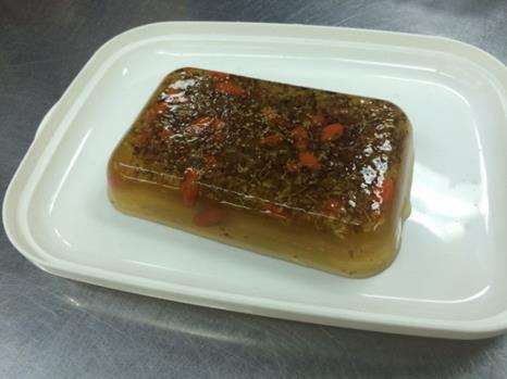 十二月是桂花的花季,萬同學建議,此時的桂花很適合做水晶桂花糕。將開水煮沸,放入適量桂花糖、枸杞和吉丁粉,待攪拌均勻再入模,冷藏凝固後即可食用。晶瑩的桂花糕浮現粒粒桂花及枸杞子,外表宛如水晶。而手工的桂花糕應趁新鮮品嘗其風味,冷藏最多可放一至二天。
