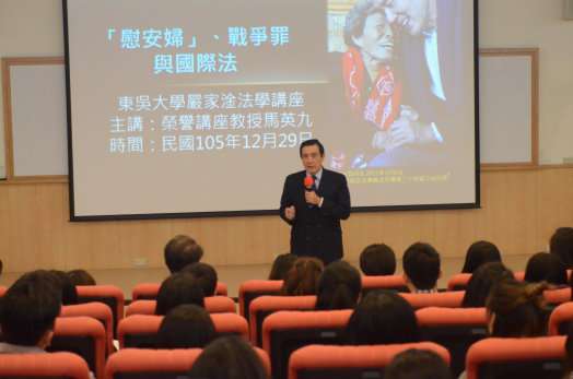 東吳大學於12月29日舉行本學期最後一場嚴家淦法學講座,由前總統馬英九教授主講「慰安婦、戰爭罪與國際法」,西元1939年爆發了第二次世界大戰,亞洲戰場深受日本帝國主義之害,所留下的悲劇更是不勝枚舉,慰安婦便是其一,時至今日,大家仍鍥而不捨的在為她們爭取公道,追究日本政府責任,望獲得誠摯的道歉。