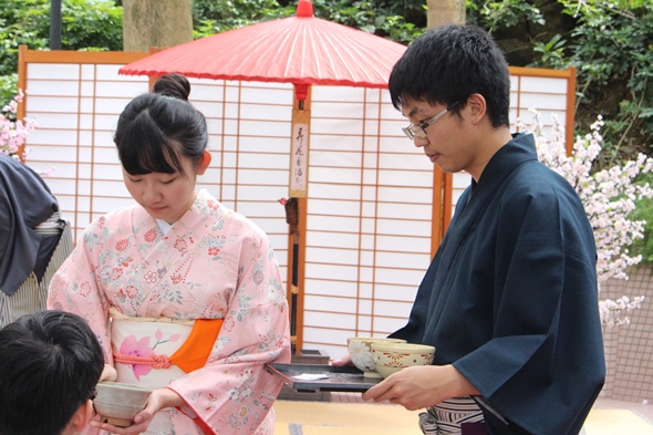 茶會中,由社員現場示範日本茶道茶會的流程,一旁還有司儀講解每個動作蘊含的意義及茶道的精神。社員穿著和服做的動作看似簡單,其實都是需要長時間的練習,克服腳麻、膝蓋紅腫,才能夠將繁複的茶會禮儀表現得從容流暢。在賞櫻茶宴,除了以喝茶靜心、修身養性,也可以學習到日本式誠摯的待客之道。