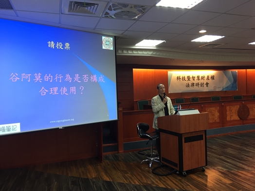 這場由本校法學院科技暨智慧財產法研究中心主辦的研討會,希望藉由專業角度介紹著作權背後複雜的法律觀念,使新聞的閱聽人不只是當「網路鄉民」,憑著直觀的想法討論議題,也能學習如何以法律觀點解構事件。