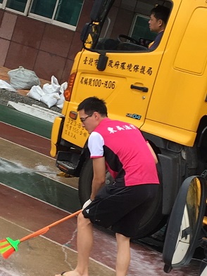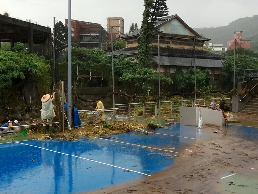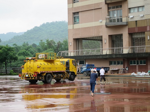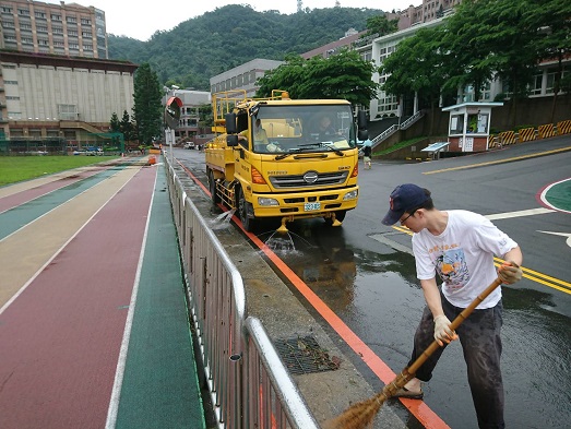 本校雙溪校區於6日2日(五)因雙溪暴漲溢淹校園後,6月3日(六)師生、同仁犧牲假期返校清理,動手清除因河水溢堤沖刷帶入的雜物與泥土,午後感謝台北市環保局支援水車加入清掃,泥濘黃土覆蓋瘡痍的操場跑道終於重見天日。