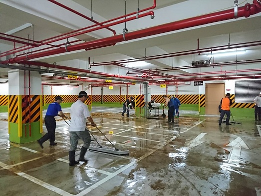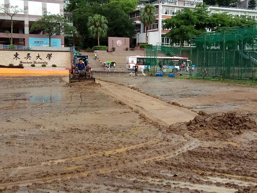 今日6月4日(日)一早,總務處同仁、全校工友及外包廠商持續展開清理工作,操場正中央動用小山貓進行掘泥;跑道利用洗車機沖刷;各方人力分散處理網球場雜葉污泥、水溝大量雜物及撿拾廢棄物等。大水淹漫校園,雖僅2個小時後退去,但留下的厚重汙泥與落葉雜物,卻令人瞠目不已,即便已動用了小山貓、吸泥機及水車機等大型機具協助,然而淤泥過多及溝渠太深,明日仍需繼續委請吸泥車進行深度清除作業。