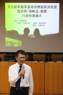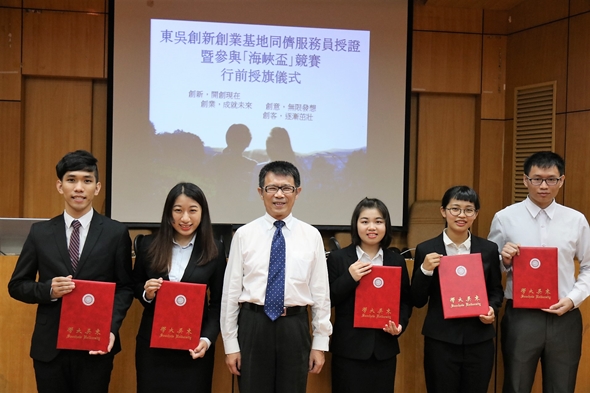 東吳創新創業基地同儕服務員授證暨參與「海峽盃」競賽行前授旗儀式於106年6月22日在城中校區5117會議室舉行,校長潘維大、主任秘書兼社資長王淑芳、商學院院長傅祖壇、企管系主任胡凱傑、生涯發展中心主任王俊雯等師長皆出席此次授旗儀式。