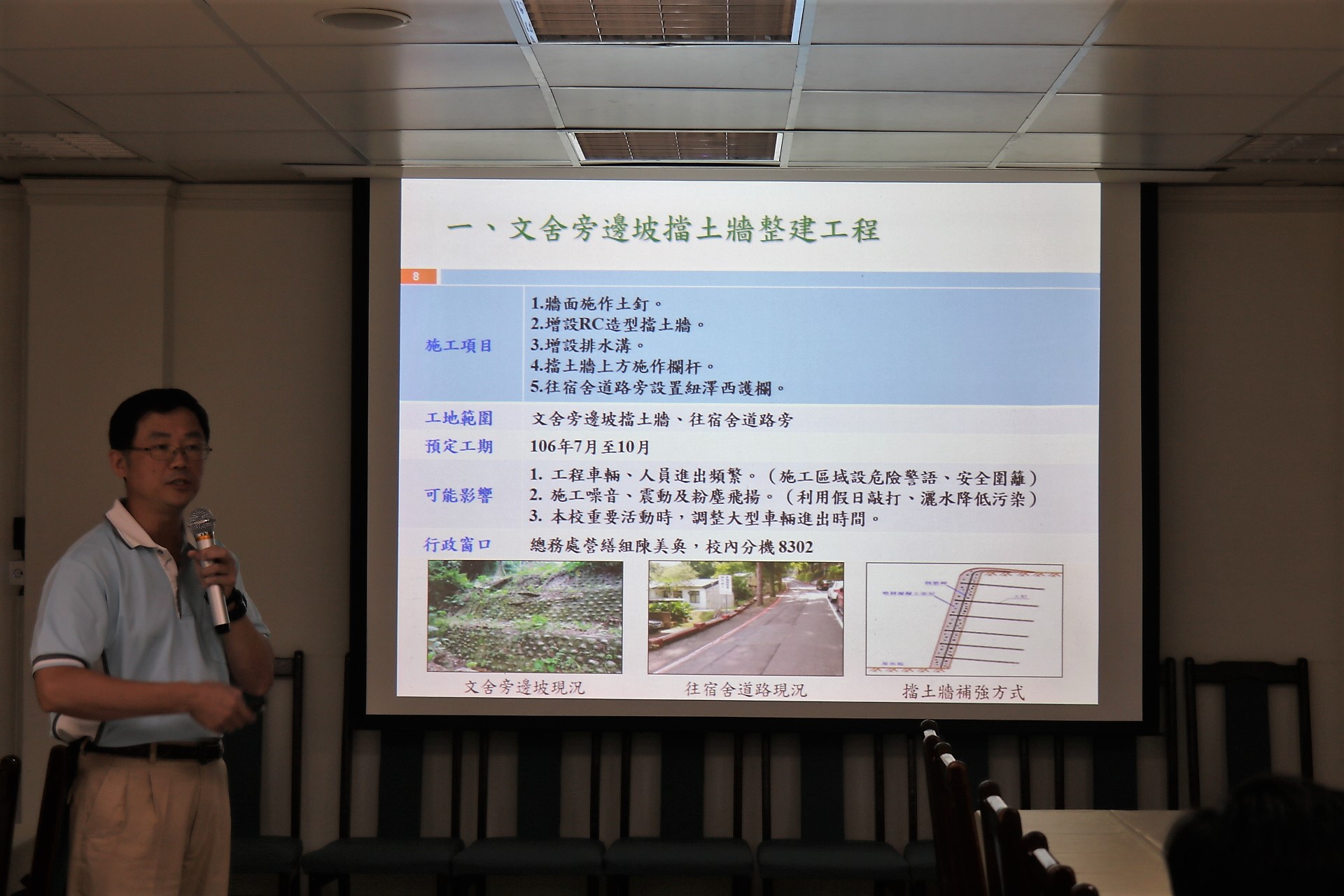 總務處於106年6月12日中午在雙溪校區G101會議室召開暑期校園工程施作說明會,由營繕組林振和組長在會議上特別針對雙溪、城中兩校區之公共區域整修及增設工程進行說明,也與與會師生同仁進行意見交流。
