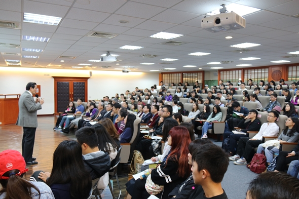 本校自105學年度起禮聘前總統馬英九先生以榮譽無給職方式擔任「嚴家淦法學講座教授」,以每月1場不同主題的演講課程,與本校同學互動對談,2018年的第1場演講「兩岸關係與國際法(二):九二共識的來龍去脈」於1月3日上午在本校城中校區崇基樓實習法庭開講,本校師生踴躍報名,熱情參與,現場一位難求。