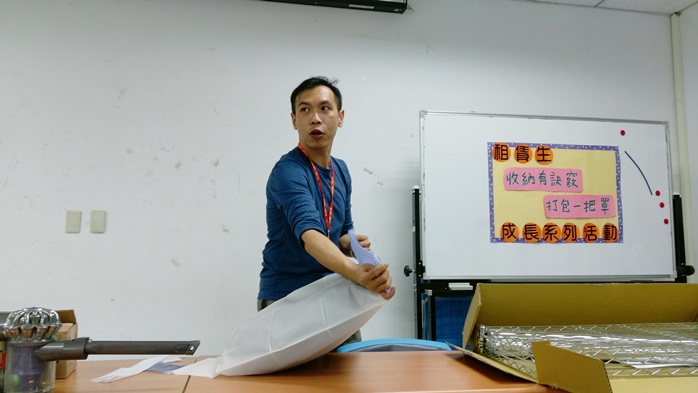常常覺得東西太多,住宿空間不敷使用?為了讓租賃生在外住得更有品質,學生住宿中心於106年11月30日在本校外雙溪校區舉辦「收納有訣竅,打包有訣竅」的演講活動,並邀請特力屋專案規畫師陳書錦,與同學分享厚重衣物、棉被該如何簡單收納,如何正確組裝和保養鍍鉻架,期許在分享後,都能讓同學在外住宿的第二個家變得更加舒適。