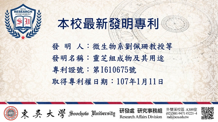 本校最新獲得發明專利1件及新型專利1件,分別是微生物系劉佩珊教授及化學系何美霖教授因執行科技部計畫所衍生之研究成果,分述如下: