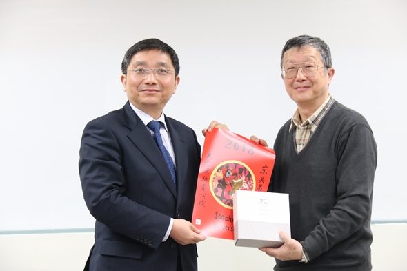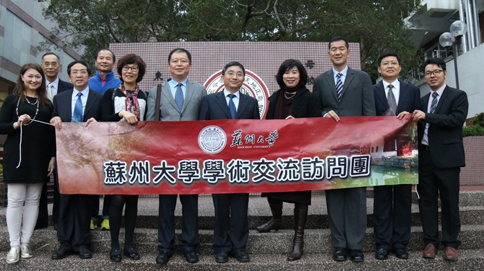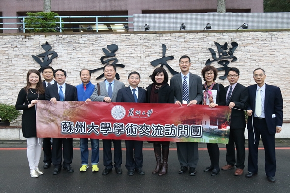 為加深兩校交流合作,蘇州大學於107年1月19日蒞臨本校,進行座談交流。本校由趙維良副校長及校友總會劉吉人理事長率領王淑芳主任秘書兼社會資源處長、校長室王玉梅專門委員兼兩岸事務中心主任、校友總會劉詩聖總顧問、體育室東方介德主任、體育室體育教學組黃景耀組長等熱情歡迎。蘇州大學(以下簡稱蘇大)則是由江涌黨委書記兼校務委員會主任帶領江蘇健康體育產業研究院王家宏執行院長、商學院王永山黨委書記兼院務委員會主任、發展委員會辦公室趙揚主任、港澳台辦公室茹翔副主任、發展委員會辦公室管文文校友部部長等蒞校參訪。