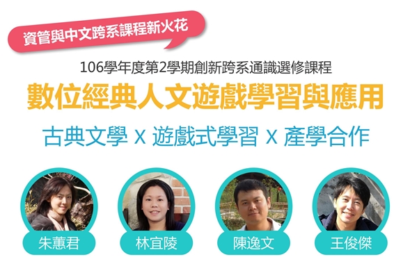 本校資訊管理系朱蕙君老師、中國文學系林宜陵老師、陳逸文老師與王俊傑老師,四人共同提出106學年度第2學期創新跨系通識選修課程——「數位經典人文遊戲學習與應用」,榮獲「教育部數位人文社會科學教學創新計畫」審查通過及經費補助,顯示本校資管系與中文系跨系合作建立創新課程,受到肯定。