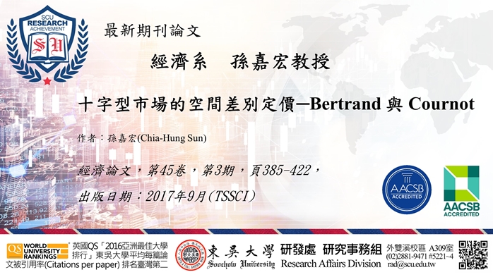 本文在十字型市場的空間型態下,研究廠商的空間差別定價及區位競爭,我們同時討論生產同質產品的雙占廠商,做 Bertrand 的價格競爭與 Cournot 的數量競爭。研究結果發現,在 Bertrand 競爭之下,不存在對稱的區位均衡,而一家廠商座落在十字型市場的中心點,另一家廠商與其區位分離,是唯一的區位均衡。在 Cournot 競爭之下,雙占廠商區位聚集在十字型市場的中心點是唯一的區位均衡。在福利分析方面,研究發現,Cournot 競爭之下的消費者剩餘、產業利潤與社會福利,皆高於 Bertrand 競爭之下的消費者剩餘、產業利潤與社會福利,此結果隱含,此十字型市場的空間競爭模型,可以解決傳統非空間模型中,消費者、廠商與政府 (社會規劃者) 之間的誘因不一致問題。