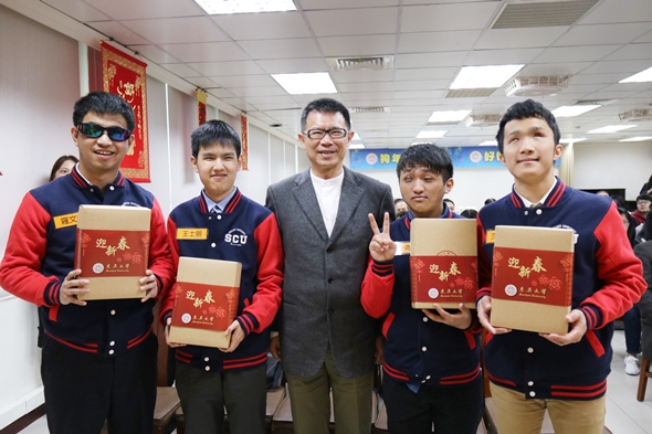 今年教職工的新春賀禮為本校政治系91級李瀚洋校友企業所生產的「健康科技襪」,希望大家在忙碌的教學與工作之餘,也要養成運動習慣,守護健康。新的一年,教學與行政團隊團結一心,繼續擦亮東吳大學百年金字招牌。