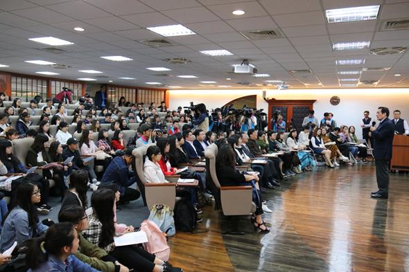 本校自105學年度起禮聘前總統馬英九先生以榮譽無給職方式擔任「嚴家淦法學講座教授」,以每月1場不同主題的演講課程,與本校同學互動對談。本次為2018年新春後的第一場演講馬英九教授以「兩岸關係與國際法(三)— 兩岸詐欺犯的共同管轄問題:送去大陸還是接回台灣?」為題,於3月13日上午在本校城中校區崇基樓實習法庭開講,校內師生報名踴躍熱情參與,現場座無虛席。